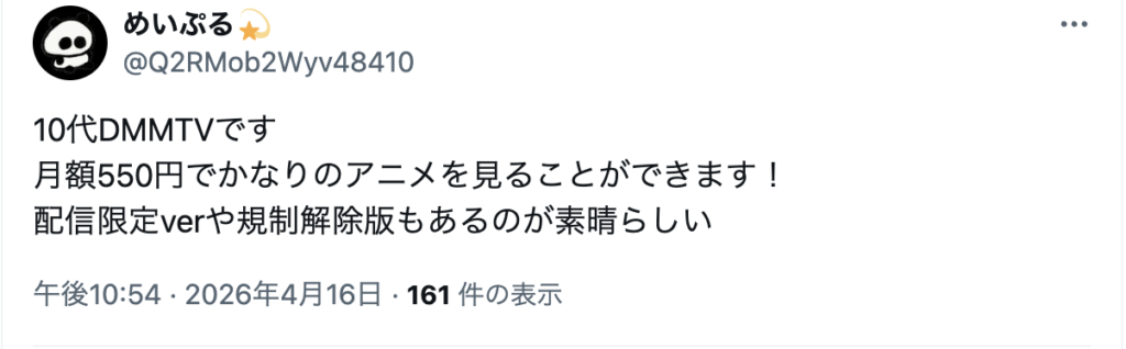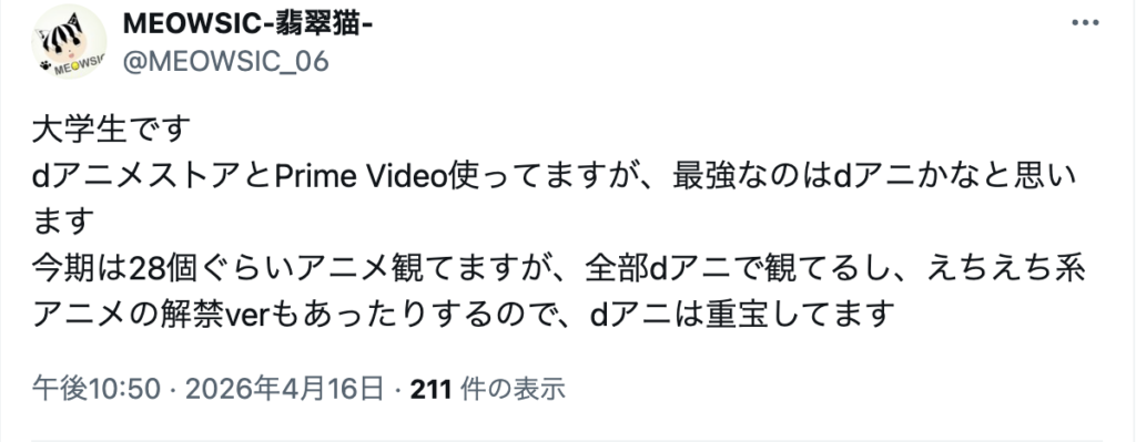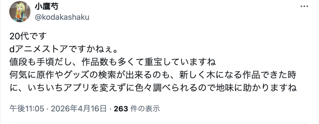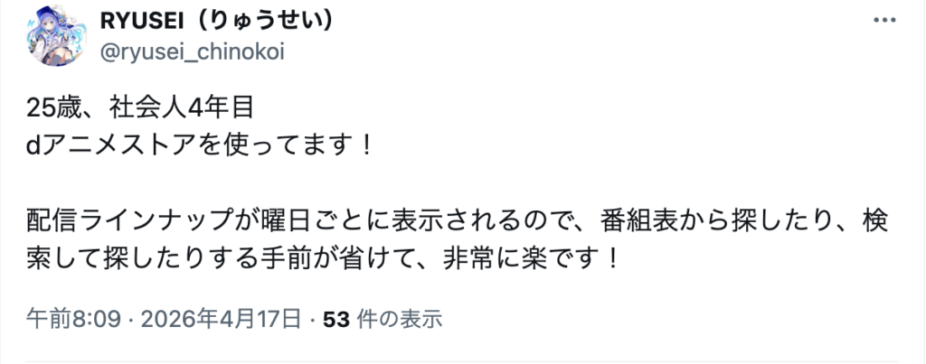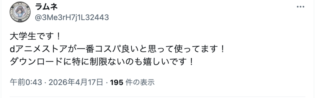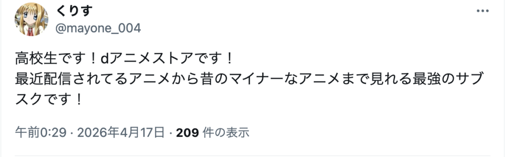 以下は実際にネット上で見つけた、dアニメストアを勧める人の意見です。
